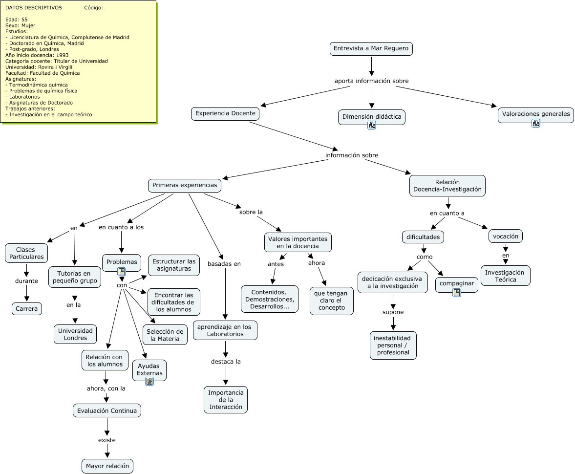 Este mapa conceptual tiene información relacionada a: Mar Reguero, Experiencia Docente información sobre Relación Docencia-Investigación, Problemas con Selección de la Materia, Primeras experiencias en Tutorías en pequeño grupo, Primeras experiencias basadas en aprendizaje en los Laboratorios, Primeras experiencias sobre la Valores importantes en la docencia, Entrevista a Mar Reguero aporta información sobre Dimensión didáctica, Valores importantes en la docencia ahora que tengan claro el concepto, Entrevista a Mar Reguero aporta información sobre Experiencia Docente, Problemas con Encontrar las dificultades de los alumnos, Problemas con Relación con los alumnos, Evaluación Continua existe Mayor relación, Tutorías en pequeño grupo en la Universidad Londres, aprendizaje en los Laboratorios destaca la Importancia de la Interacción, dificultades como compaginar, Relación Docencia-Investigación en cuanto a dificultades, vocación en Investigación Teórica, Entrevista a Mar Reguero aporta información sobre Valoraciones generales, Problemas con Estructurar las asignaturas, Problemas con Ayudas Externas, Primeras experiencias en Clases Particulares