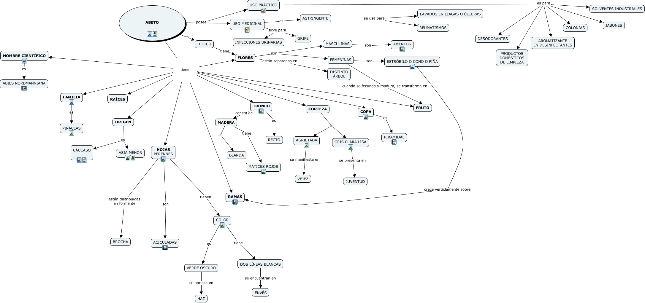 Este Cmap, tiene información relacionada con: Abeto, USO PRÁCTICO es para AROMATIZANTE EN DESINFECTANTES, FEMENINAS cuando se fecunda y madura, se transforma en FRUTO, HOJAS PERENNES están distribuidas en forma de BROCHA, ASTRINGENTE se usa para REUMATISMOS, MASCULINAS son AMENTOS, ABETO posee USO PRÁCTICO, GRIS CLARA LISA se presenta en JUVENTUD, CORTEZA es AGRIETADA, FAMILIA es PINÁCEAS, USO PRÁCTICO es para SOLVENTES INDUSTRIALES, CORTEZA es GRIS CLARA LISA, AGRIETADA se manifiesta en VEJEZ, ABETO es DIOICO, ABETO tiene RAMAS, ABETO tiene FAMILIA, ESTRÓBILO O CONO O PIÑA crece verticlamente sobre RAMAS, DOS LÍNEAS BLANCAS se encuentran en ENVÉS, ABETO tiene FRUTO, VERDE OSCURO se aprecia en HAZ, ABETO tiene CORTEZA