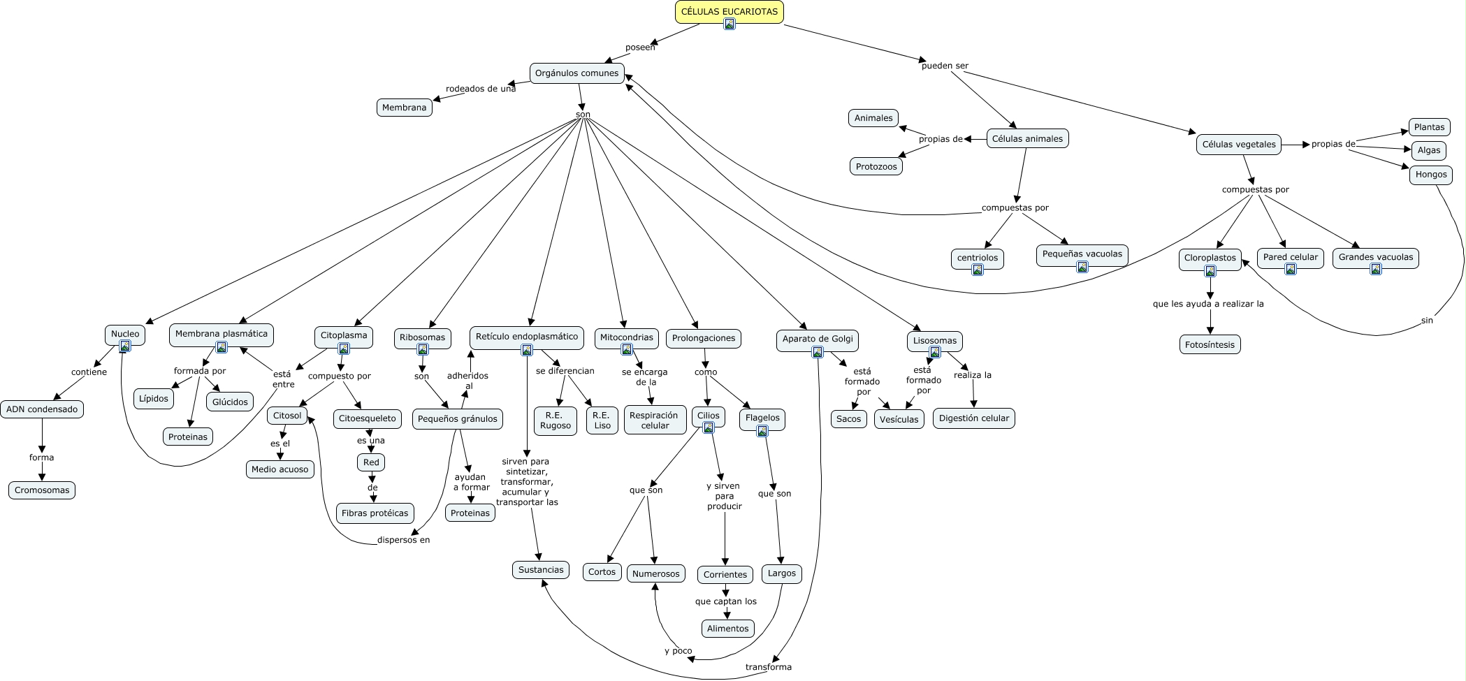 Este Cmap, tiene información relacionada con: Célula eucariota, Orgánulos comunes son Retículo endoplasmático, Ribosomas son Pequeños gránulos, Aparato de Golgi transforma Sustancias, Hongos sin Cloroplastos, Células vegetales compuestas por Orgánulos comunes, Células vegetales compuestas por Pared celular, Orgánulos comunes son Mitocondrias, Células animales propias de Protozoos, Citoesqueleto es una Red, Orgánulos comunes son Citoplasma, Células animales compuestas por Pequeñas vacuolas, Mitocondrias se encarga de la Respiración celular, Corrientes que captan los Alimentos, Retículo endoplasmático sirven para sintetizar, transformar, acumular y transportar las Sustancias, ADN condensado forma Cromosomas, Orgánulos comunes son Lisosomas, Células animales compuestas por Orgánulos comunes, CÉLULAS EUCARIOTAS poseen Orgánulos comunes, Cilios que son Cortos, CÉLULAS EUCARIOTAS pueden ser Células vegetales