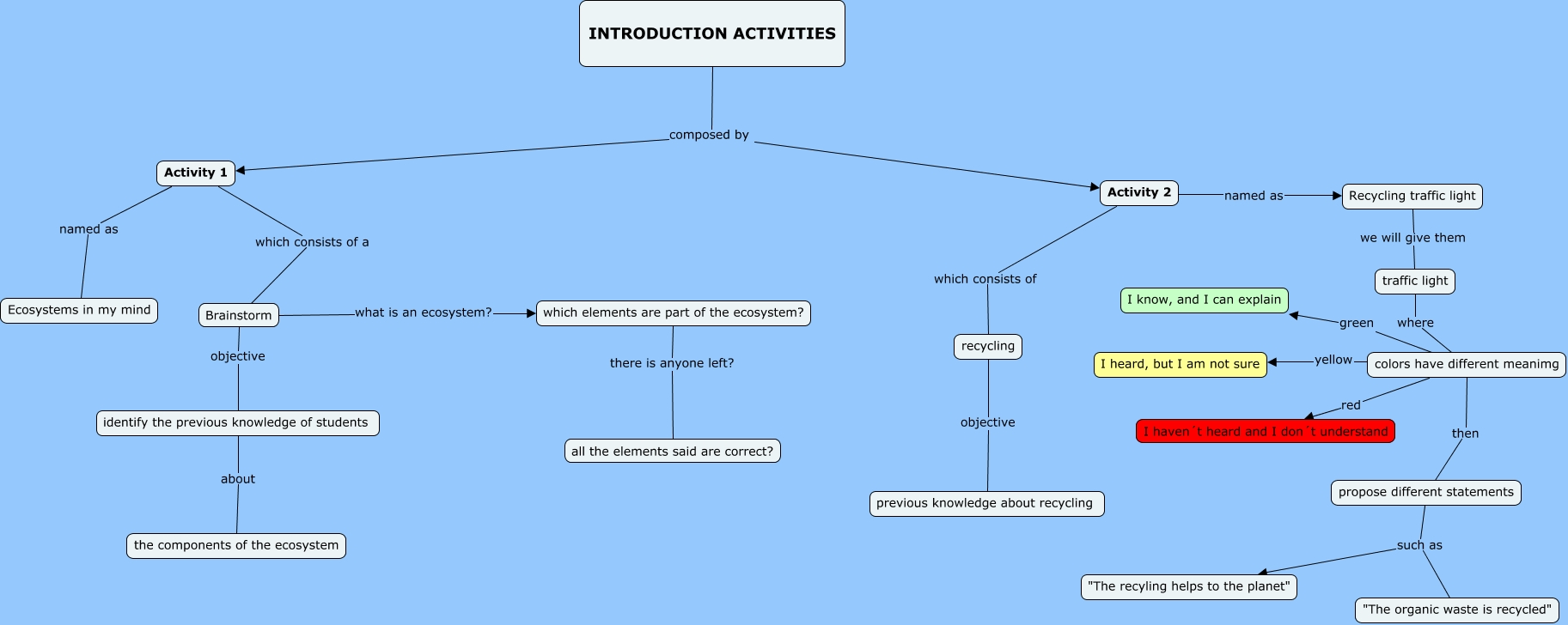 Este Cmap, tiene información relacionada con: Introduction activities, propose different statements such as "The recyling helps to the planet", Activity 2 named as Recycling traffic light, Activity 1 which consists of a Brainstorm, colors have different meanimg green I know, and I can explain, traffic light where colors have different meanimg, Brainstorm objective identify the previous knowledge of students, INTRODUCTION ACTIVITIES composed by Activity 1, recycling objective previous knowledge about recycling, Activity 1 named as Ecosystems in my mind, which elements are part of the ecosystem? there is anyone left? all the elements said are correct?, Brainstorm what is an ecosystem? which elements are part of the ecosystem?, colors have different meanimg yellow I heard, but I am not sure, colors have different meanimg then propose different statements, Recycling traffic light we will give them traffic light, INTRODUCTION ACTIVITIES composed by Activity 2, colors have different meanimg red I haven´t heard and I don´t understand, identify the previous knowledge of students about the components of the ecosystem, propose different statements such as "The organic waste is recycled", Activity 2 which consists of recycling