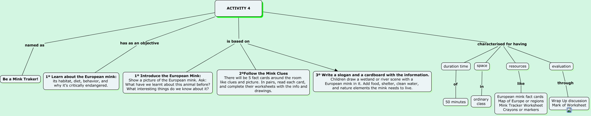 Este Cmap, tiene información relacionada con: Activity 4, resources like European mink fact cards Map of Europe or regions Mink Tracker Worksheet Crayons or markers, ACTIVITY 4 is based on 2ºFollow the Mink Clues There will be 5 fact cards around the room like clues and picture. In pairs, read each card, and complete their worksheets with the info and drawings., duration time of 50 minutes, ACTIVITY 4 is based on 3º Write a slogan and a cardboard with the information. Children draw a wetland or river scene with a European mink in it. Add food, shelter, clean water, and nature elements the mink needs to live., ACTIVITY 4 named as Be a Mink Traker!, ACTIVITY 4 characterised for having duration time, ACTIVITY 4 is based on 1º Introduce the European Mink: Show a picture of the European mink. Ask: What have we learnt about this animal before? What interesting things do we know about it?, space in ordinary class, ACTIVITY 4 characterised for having evaluation, evaluation through Wrap Up discussion Mark of Worksheet, ACTIVITY 4 has as an objective 1º Learn about the European mink: its habitat, diet, behavior, and why it's critically endangered., ACTIVITY 4 characterised for having space, ACTIVITY 4 characterised for having resources