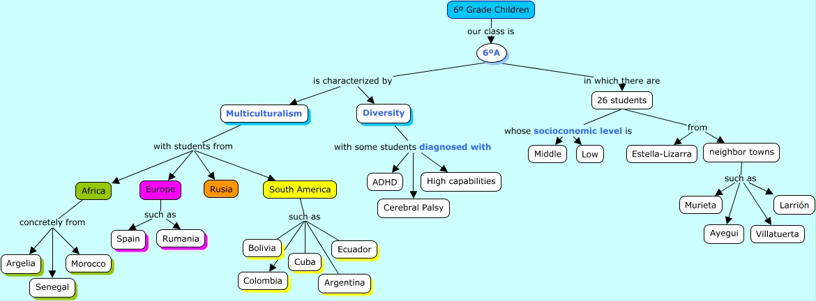 Este Cmap, tiene información relacionada con: Context Children, Ecuador such as Colombia, 6ºA in which there are 26 students, 26 students whose socioconomic level is Low, Multiculturalism with students from Rusia, Europe such as Rumania, Diversity with some students diagnosed with ADHD, Diversity with some students diagnosed with High capabilities, Multiculturalism with students from Europe, Multiculturalism with students from South America, South America such as Colombia, 26 students from neighbor towns, neighbor towns such as Murieta, Bolivia such as Colombia, Multiculturalism with students from Africa, Cuba such as Colombia, neighbor towns such as Larrión, 6ºA is characterized by Diversity, neighbor towns such as Villatuerta, 6ºA is characterized by Multiculturalism, 26 students from Estella-Lizarra
