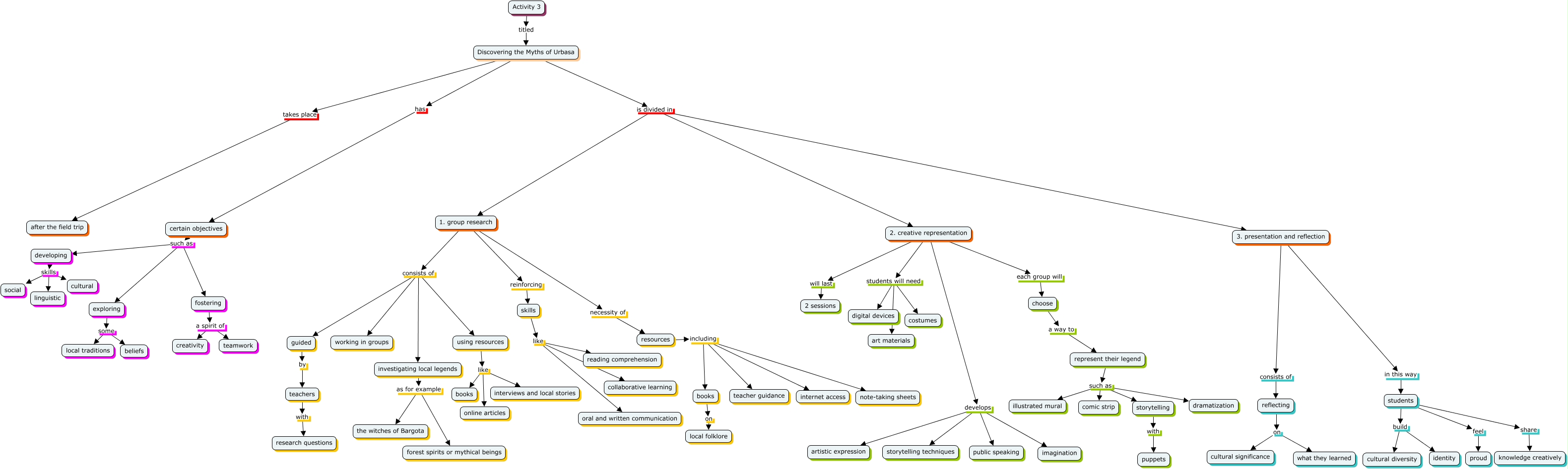 Este Cmap, tiene información relacionada con: Activity 3, 1. group research consists of working in groups, books on local folklore, developing skills linguistic, 1. group research necessity of resources, resources including books, Activity 3 titled Discovering the Myths of Urbasa, 2. creative representation students will need art materials, reflecting on what they learned, Discovering the Myths of Urbasa takes place after the field trip, exploring some beliefs, reflecting on cultural significance, exploring some local traditions, skills like oral and written communication, Discovering the Myths of Urbasa is divided in 2. creative representation, represent their legend such as illustrated mural, fostering a spirit of teamwork, 1. group research reinforcing skills, Discovering the Myths of Urbasa is divided in 1. group research, using resources like online articles, 2. creative representation students will need costumes